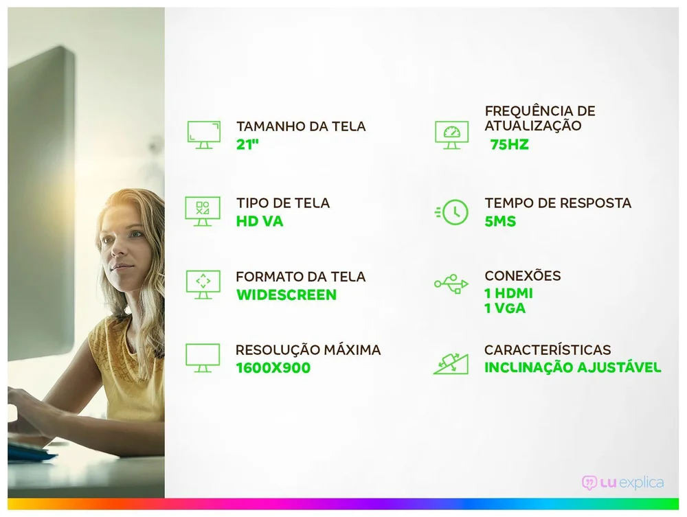 - Design Compacto e Funcional: Formato widescreen de 21 polegadas com base removível, ideal para otimizar o espaço em mesas de trabalho.